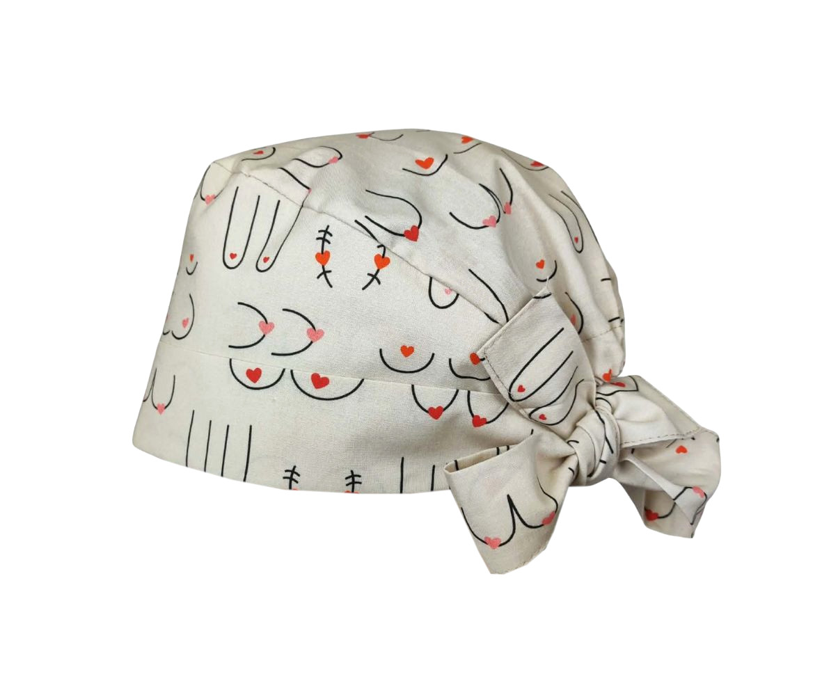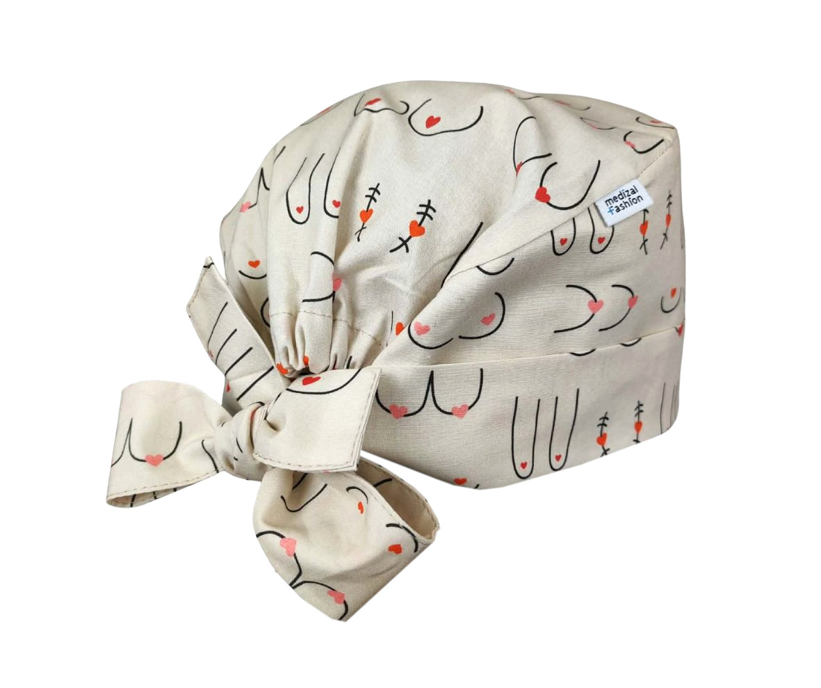 Czepek wiązany z tyłu na szerokie wiązania, idealnie dopasowuje się do rozmiaru głowy właściciela. Dzięki zastosowaniu cienkiej bawełny zapewnia przepływ powietrza oraz komfort użytkowania. Wyróżnia się ciekawym i oryginalnym wzorem w piersi.