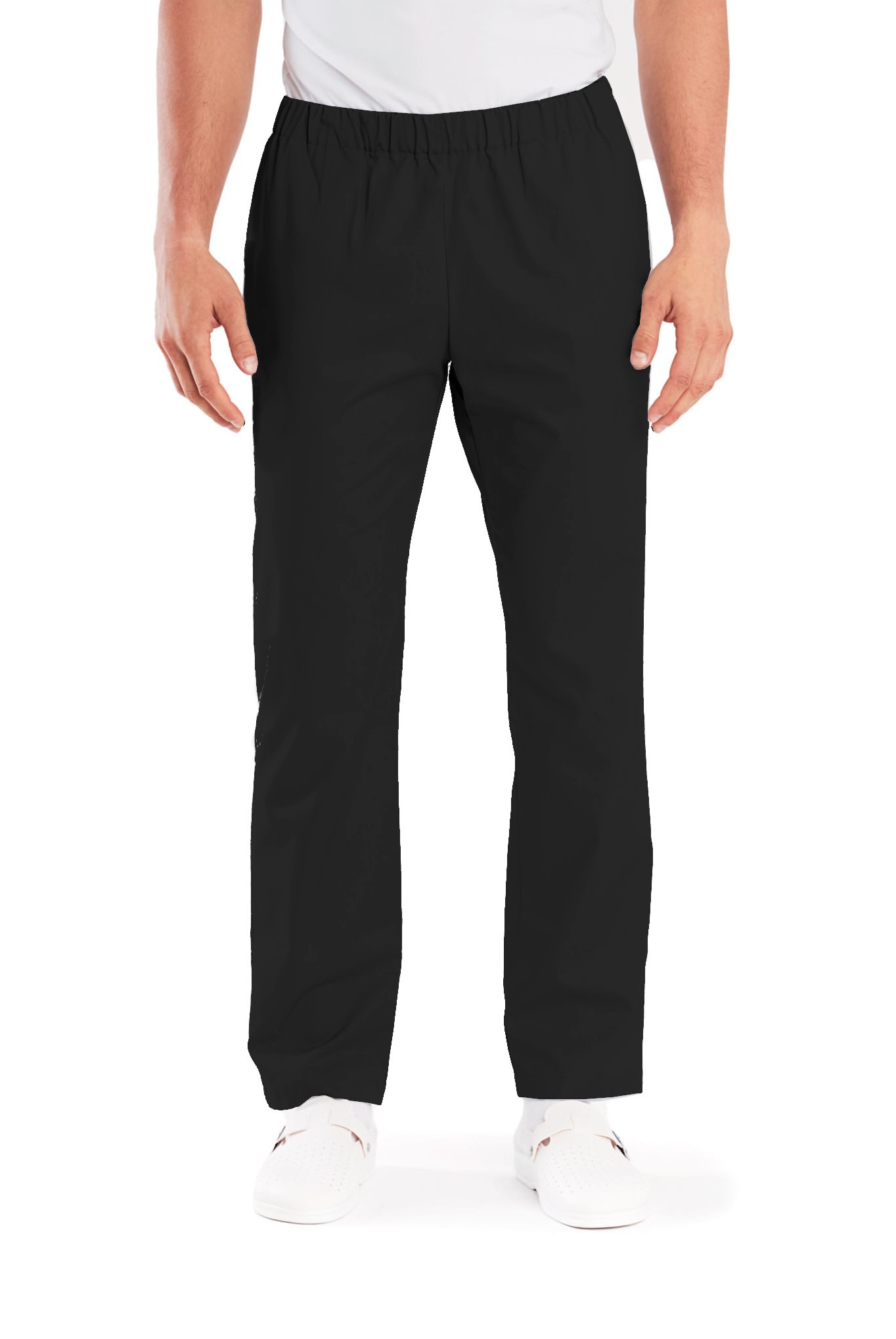 Luźny, prosty fason spodni męskich ściągniętych w pasie gumą. Z boku posiadają dwie kieszenie na linii szwów bocznych. Nogawka prosta, bez ściągaczy.